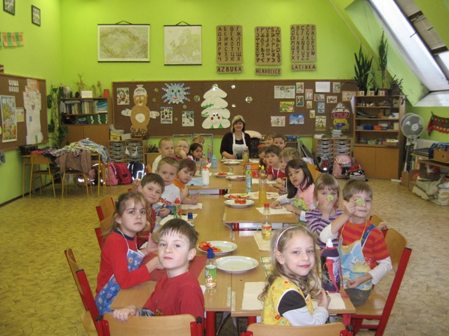 Žáci z donesených surovin připravili svačinu - řádně si umyli ruce, oloupali a nakrájeli zeleninu, ozdobili zeleninové talíře, vyrobili v mixéru sýrovou a rybí pomazánku, namazali si tmavý chléb a stolovali u společného stolu.